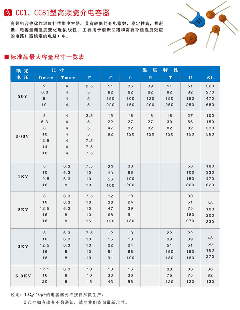 CC1系列為一類高頻低壓瓷介電容器,用在低損耗和電容量高穩(wěn)定性的地方或用在要求溫度系數(shù)有明確規(guī)定的地方。如:諧振回路、高頻旁路、溫度補(bǔ)償、控制電路時間常數(shù)的元件,穩(wěn)定性要求高的耦合元件。CC81系列為一類高頻高壓瓷介電容器,用于UR≥0.63KV以上的高壓諧振電路中,或用在低損耗和電容量穩(wěn)定性的地方或用在要求溫度系數(shù)有明確規(guī)定的地方。