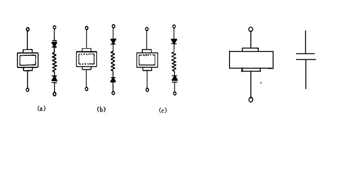 a為正常狀態(tài)下的等效電路,其中上、下兩個電容器代表上、下兩個介質(zhì)層的電容;兩個箭頭表示和N型半導(dǎo)瓷的接觸狀態(tài);中間部分則表示半導(dǎo)體瓷中尚有一定的電阻。 b和c則分別表示兩邊或一邊介質(zhì)層被損壞后的不正常情況。介質(zhì)層被損壞的程度不同則二極管的正、反電阻也不同,因此它并不意味著是一個常規(guī)的二極管。